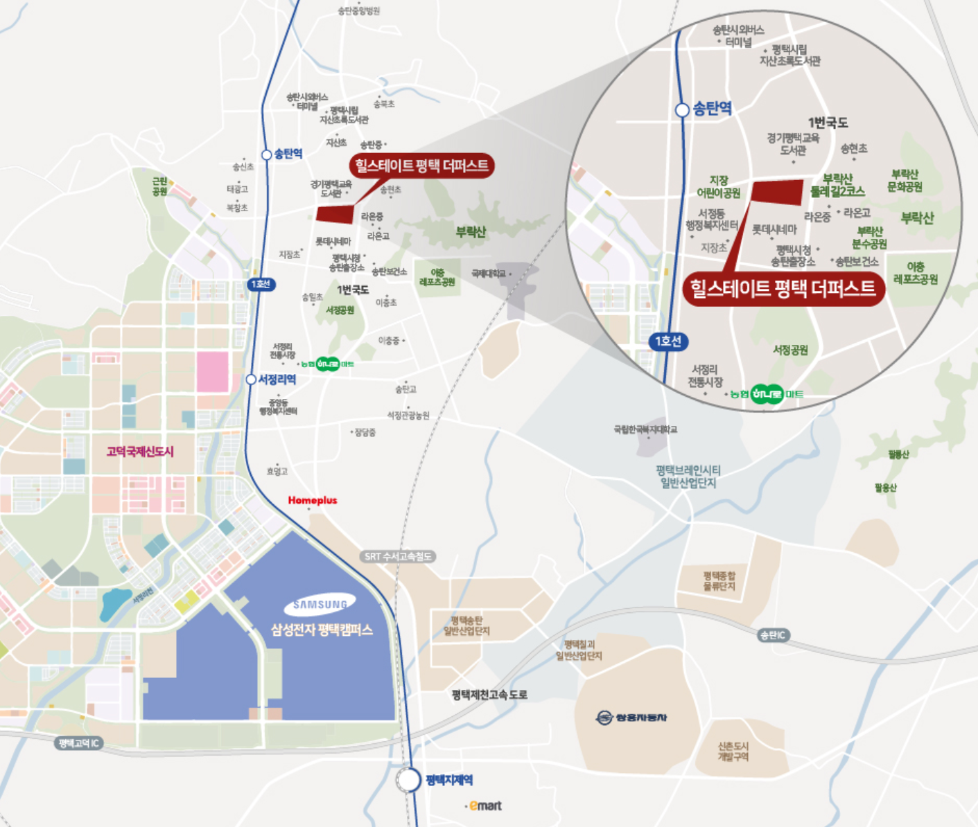 재건축 단지의 특징이 이미 인프라가 갖춰진 지역으로 반경 1Km 내에는 송탄역 상권과 서정동 상권이 위치해 편의시설이 잘 갖춰져 있습니다. 도보권으로 지장초, 송현초, 라온중, 라온고 등이 위치해 있고, 부락산 둘레길과 문화공원, 서정공원 등도 가깝습니다.