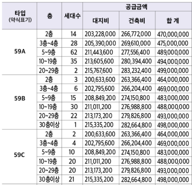 최고가 기준으로 분양가는 59㎥A 타입의 경우 최저 4억 7천만원부터 시작해서 84㎥A 6억 4천4백만원까지 다양한 평형이 있는 만큼 층수 및 타입별로 다양합니다.