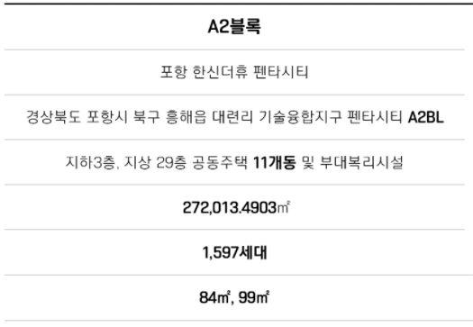 아파트 위치는 경상북도 포항시 북구 흥해읍 대련리로 한신더휴 펜타시티는 A2블록과 A4블록을 각각 인허가를 득한 개별사업장으로 청약 계약 시 분양평수와 세대수, 분양가가 다르기 때문에 분양내용을 참고하시기 바랍니다.