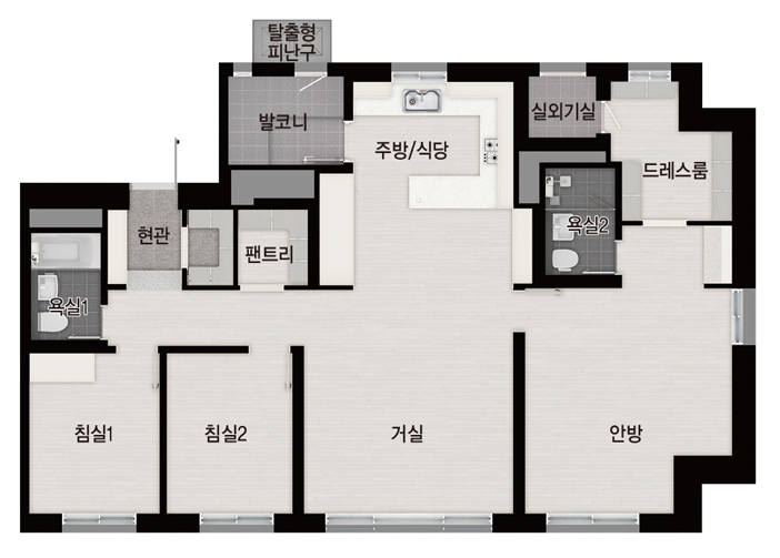 아파트 중 가장 돋보이는 주택형은 84A형(217가구)입니다. 거실과 침실 등에 설치된 전면 발코니와 우측 발코니를 모두 확장해 실사용공간을 훨씬 넓혔습니다. 주방과 거실이 연결된 맞통풍 구조로 설계돼 환풍성이 탁월할 전망입니다. 주방은 ‘ㄷ’자 구조로 꾸며 주부들의 이동동선을 단순화하고 수납공간을 넓습니다. 또, 주방 바로 옆에 펜트리와 발코니를 설치해 각종 잡동사니의 보관을 수월하게 했습니다.