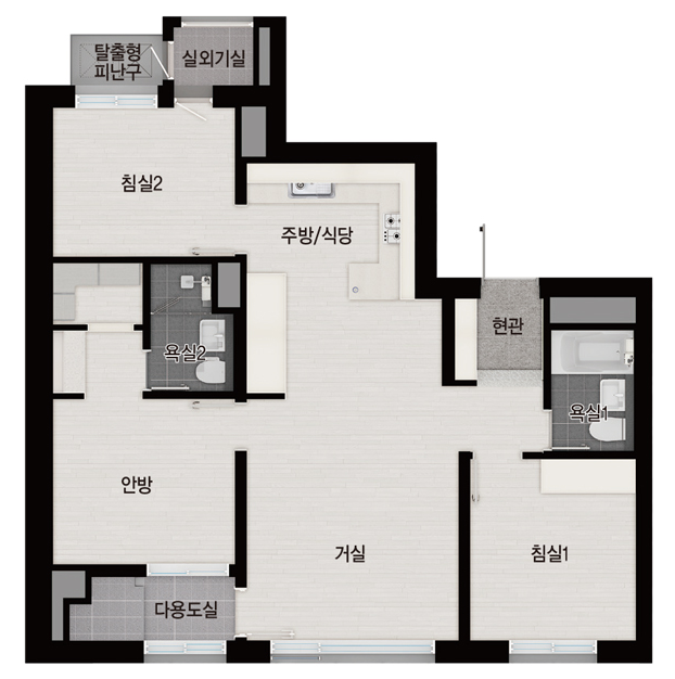 오피스텔에 해당하는 84O형은 3베이·3룸 구조로 적용되었습니다. 아파트와 마찬가지로 욕실은 2곳에 설치되었습니다. 안방 바로 앞에는 다용도실을 설치해 입주민들의 취향에 따라 사용할 수 있도록 했습니다. 또. 안방에 드레스룸을 마련해 가족 단위의 4계절 의류를 모두 보관해도 부족함이 없어 보입니다.
