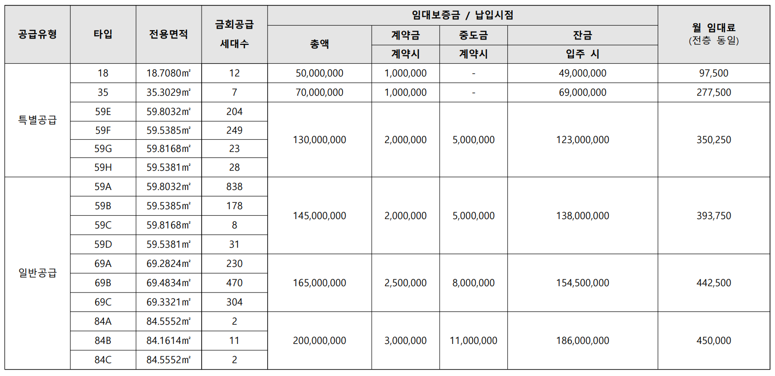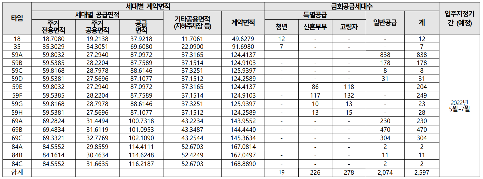 주택타입 (59A/ 59E), (59B/ 59F), (59C/ 59G), (59D/ 59H) 타입은 공급 내용(일반/특별)을 나누기 위하여 구분한 것으로 동일한 면적입니다.