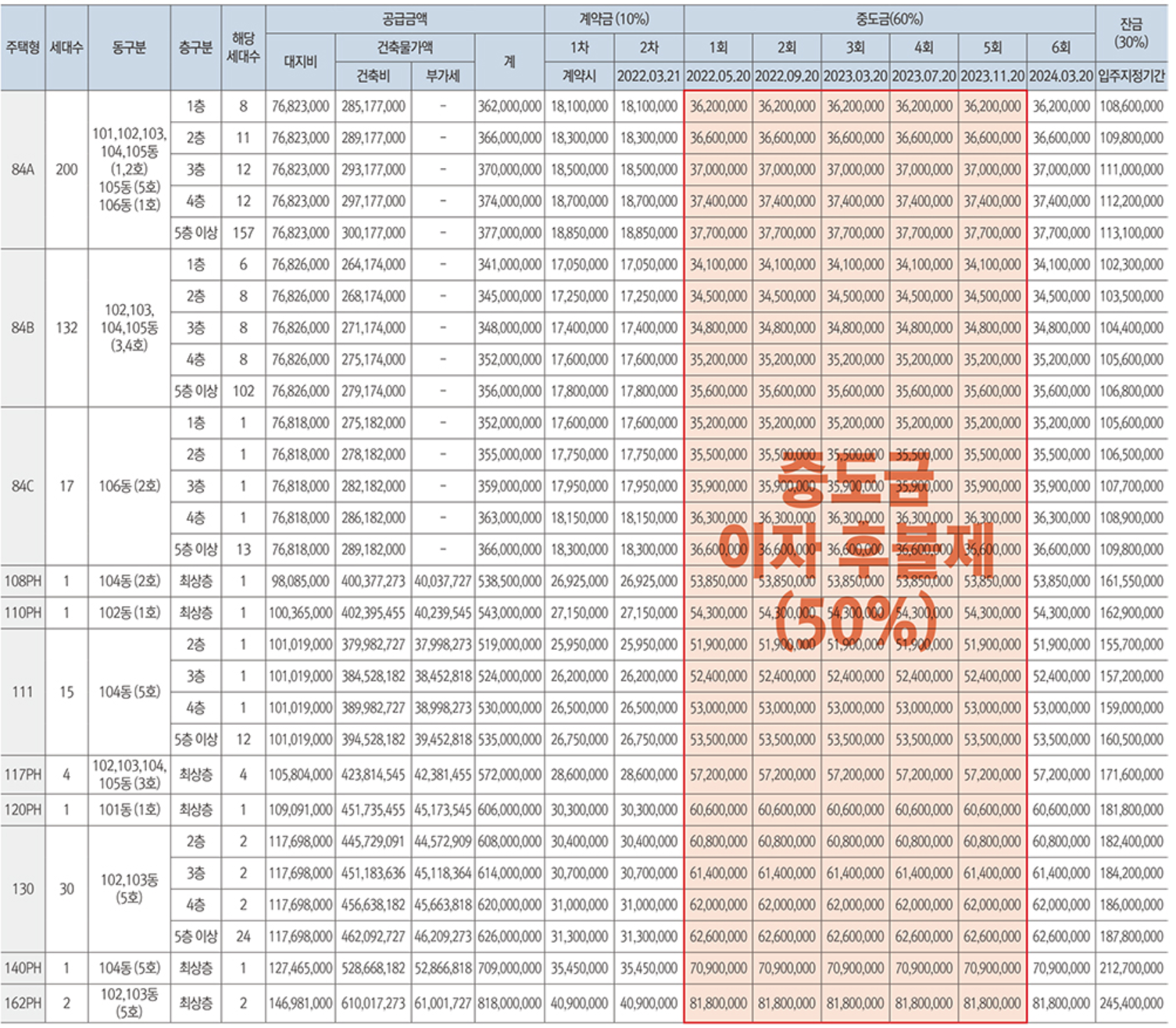 본 아파트는 사업주체가 알선한 금융기관을 통해 중도금 대출 신청이 가능할 경우에도, 금융 관련 정부 정책, 대출 금융기관의 여신관리규정, 집단대출 보증기관의 관리규정 등으로 대출조건이 각 세대별, 각 개인별로 상이하거나, 최종적으로 중도금 대출 실행이 불가할 수 있음을 인지하시기 바라며 이에 따른 중도금 대출 불가 및 대출한도 축소 등으로 인한 개인적인 불이익에 대한 모든 책임은 계약자 본인에게 있고 이와 관련된 책임을 사업주체 및 시공사가 부담하지 않습니다. 재외동포 및 외국인의 경우 대출 가능 여부 반드시 확인이 필요하겠습니다.