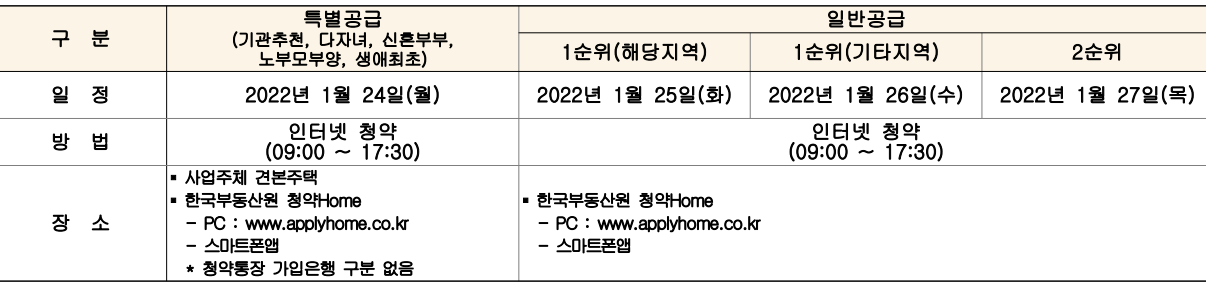 고령자, 장애인 등 인터넷 청약이 불가한 경우에 한해 특별공급은 견본주택 방문접수(10:00~14:00, 은행 창구 접수 불가), 일반공급은 청약통장 가입은행 본・지점(09:00~16:00)에서 청약 가능합니다.