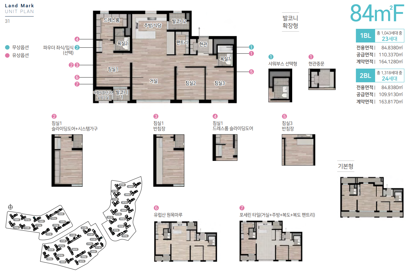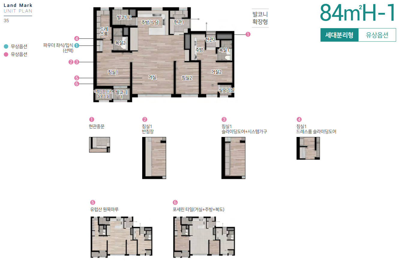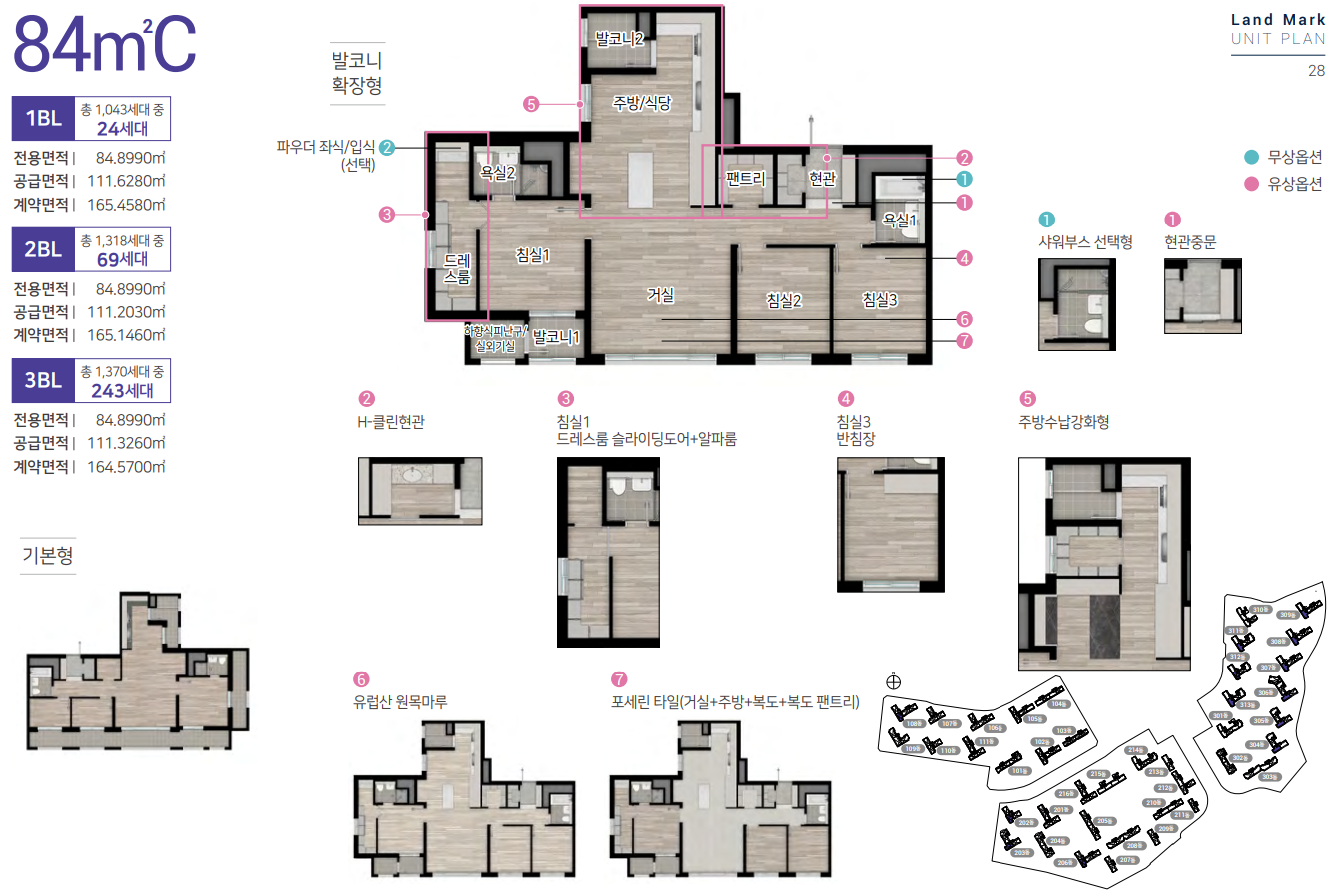전용면적 84㎡ C타입은 H-클린 현관이 옵션으로 제공되며 복도 및 팬트리, 안방 드레스룸과 알파룸 등 수납공간을 극대화했습니다.