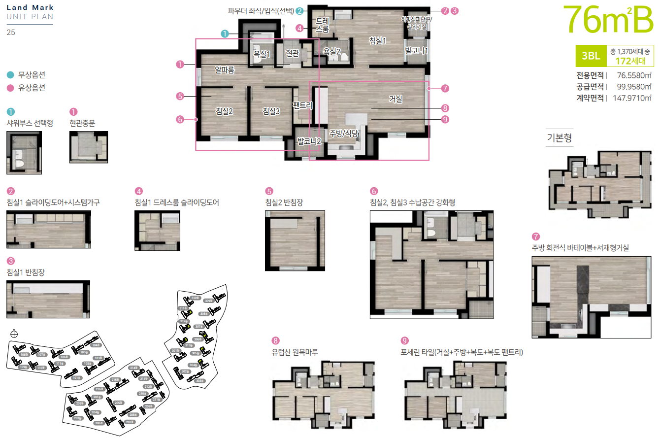 전용면적 76㎡ A, B타입의 경우 복도 팬트리 및 안방 드레스룸이 적용되었습니다.