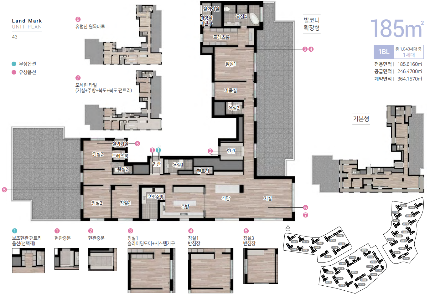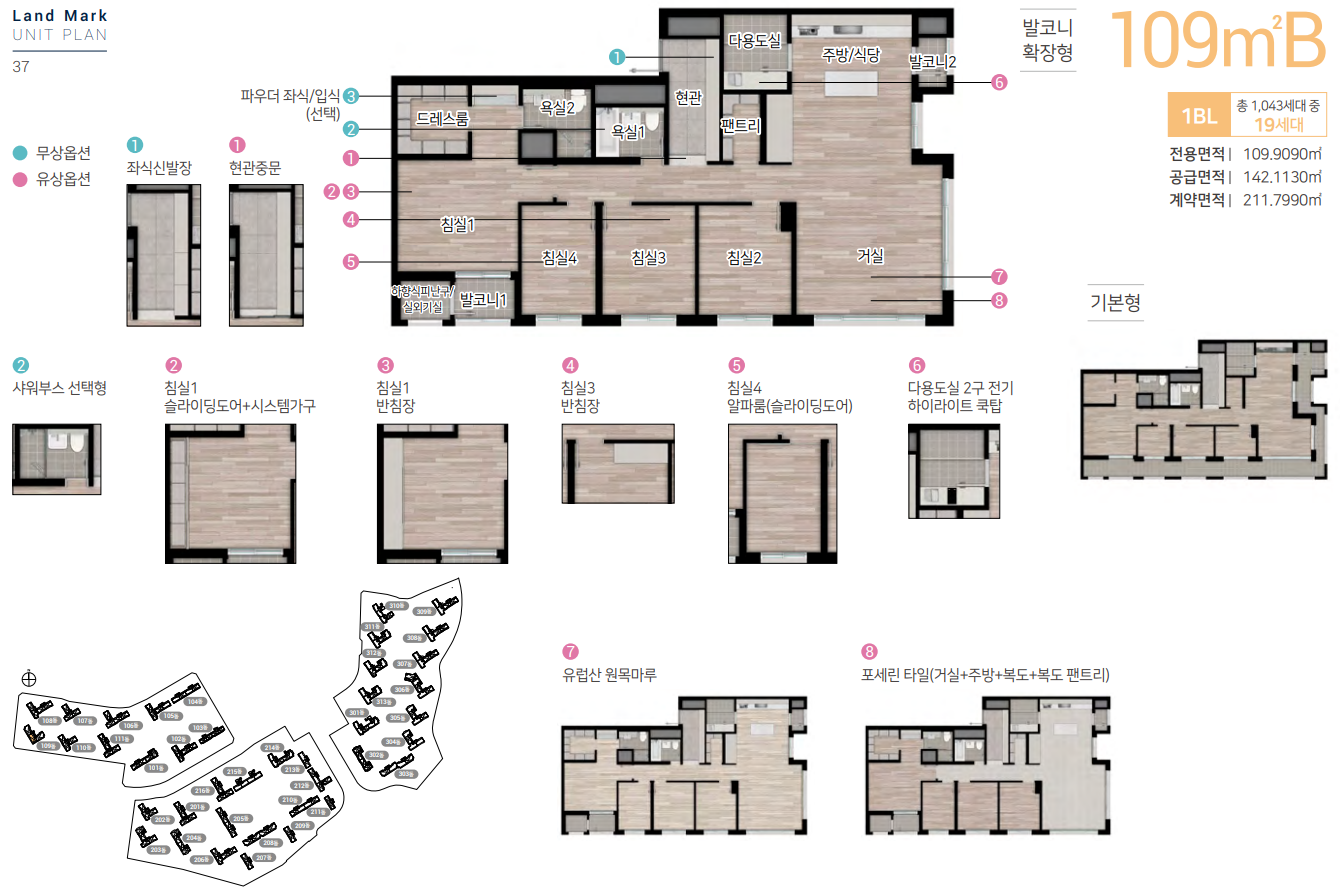 전용면적 109㎡ A타입은 4.5 Bay 판상형 구조로 현관 팬트리, 복도 팬트리, 안방 드레스룸, 알파룸 등이 적용되었습니다.