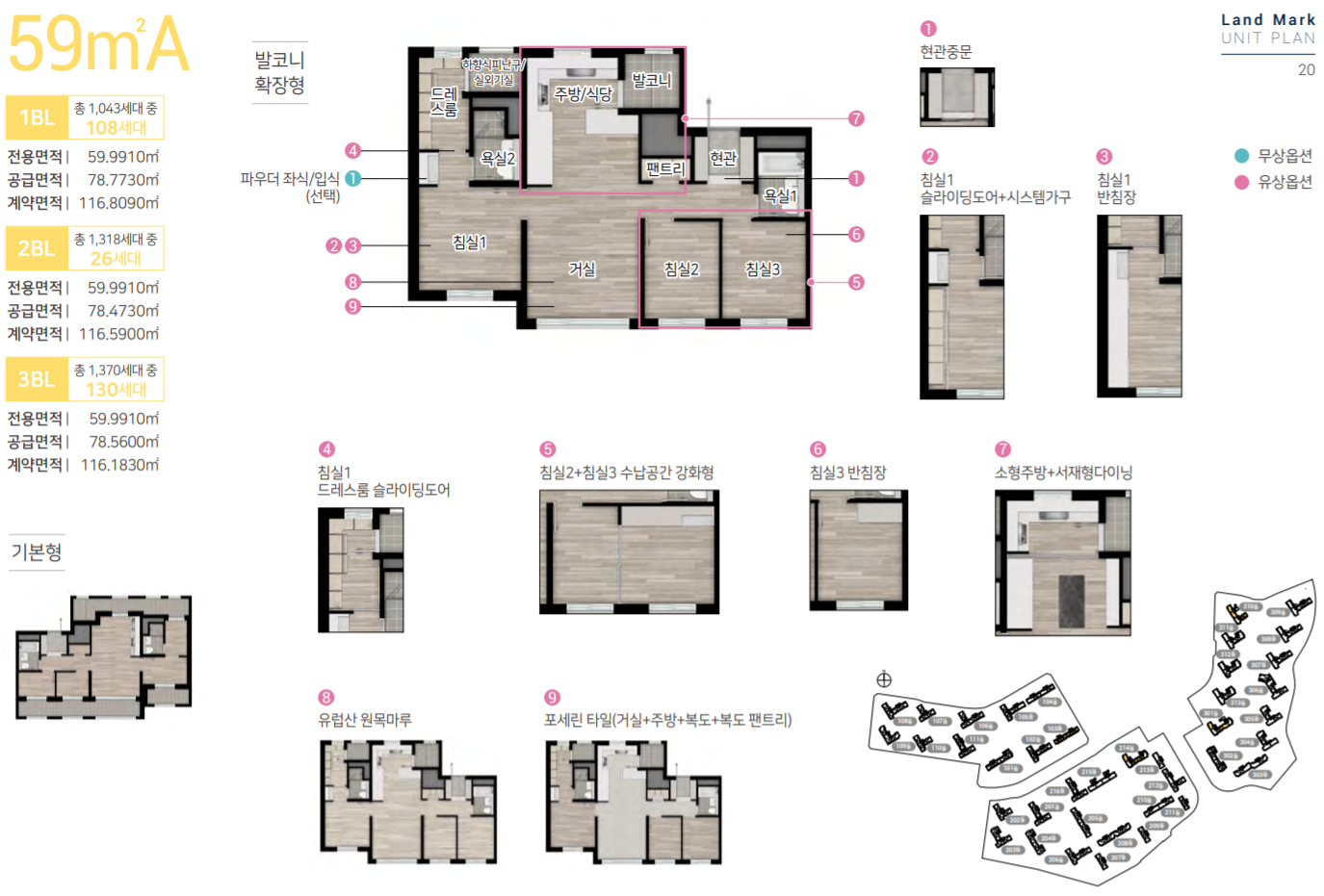 전용면적 59㎡ A타입의 경우 4 Bay 판상형 구조로 안방 드레스룸뿐만 아니라 소형 평형에서 보기 드문 복도 팬트리가 적용되어 넉넉한 수납공간을 확보했습니다.