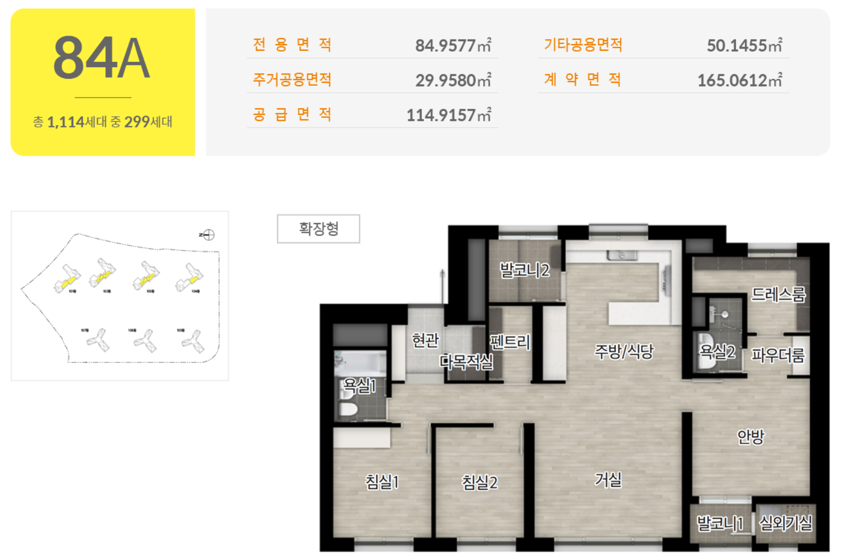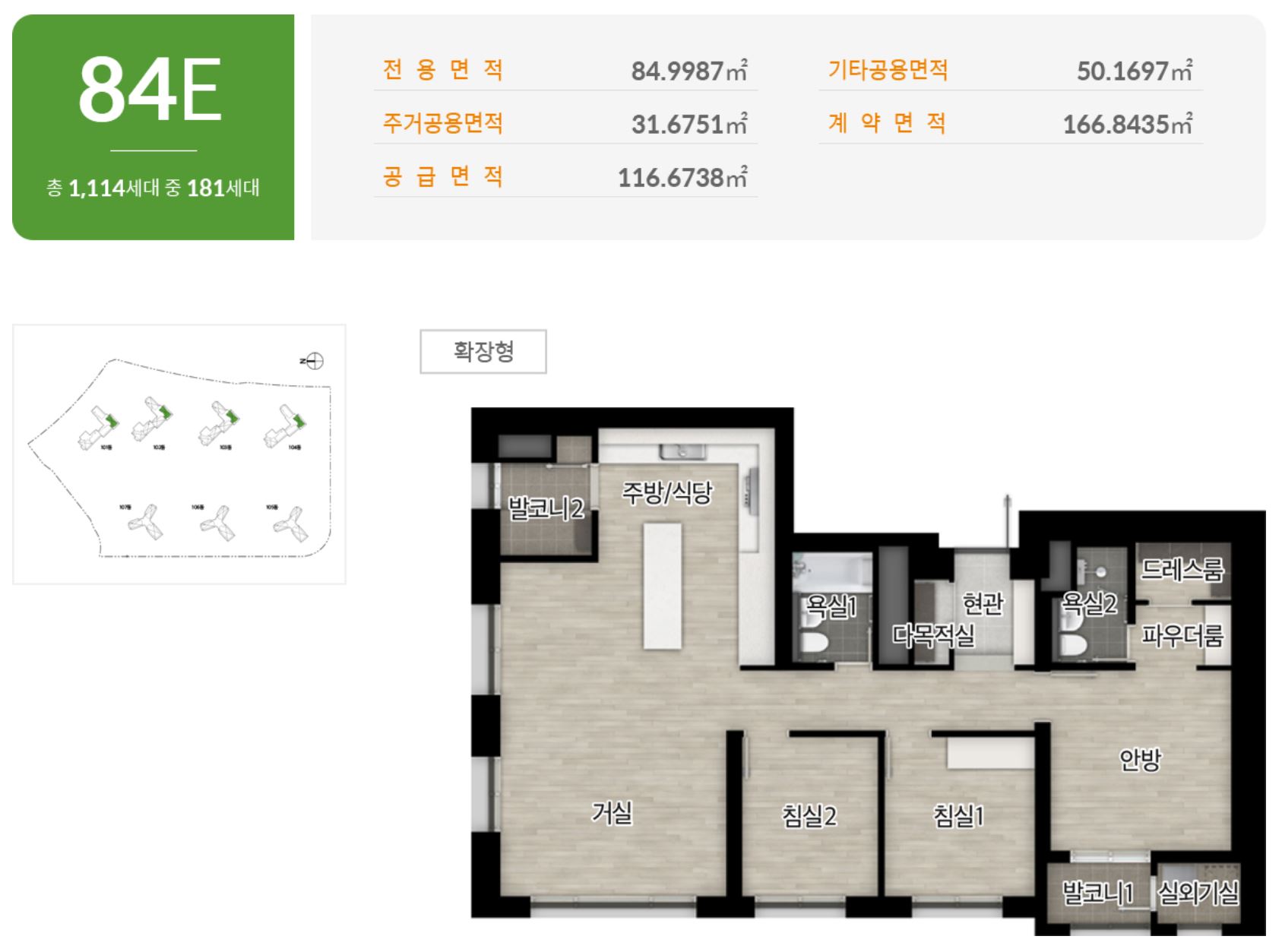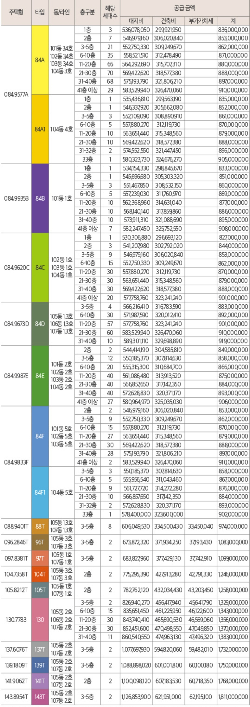 ▲84㎡ 1천2가구 ▲130㎡ 88가구 ▲88㎡T 8가구 ▲96㎡T 2가구 ▲97㎡T 2가구▲104㎡T 2가구 ▲105㎡T 2가구 ▲137㎡T 2가구 ▲139㎡T 2가구 ▲141㎡T 2가구 ▲143㎡T 총 1,114가구입니다.