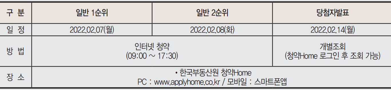 청약접수 기간은 2월 7일 월요일 1순위(해당 지역, 기타 지역), 2월 8일 화요일 2순위 접수를 진행하며, 당첨자 발표는 2월 14일입니다.