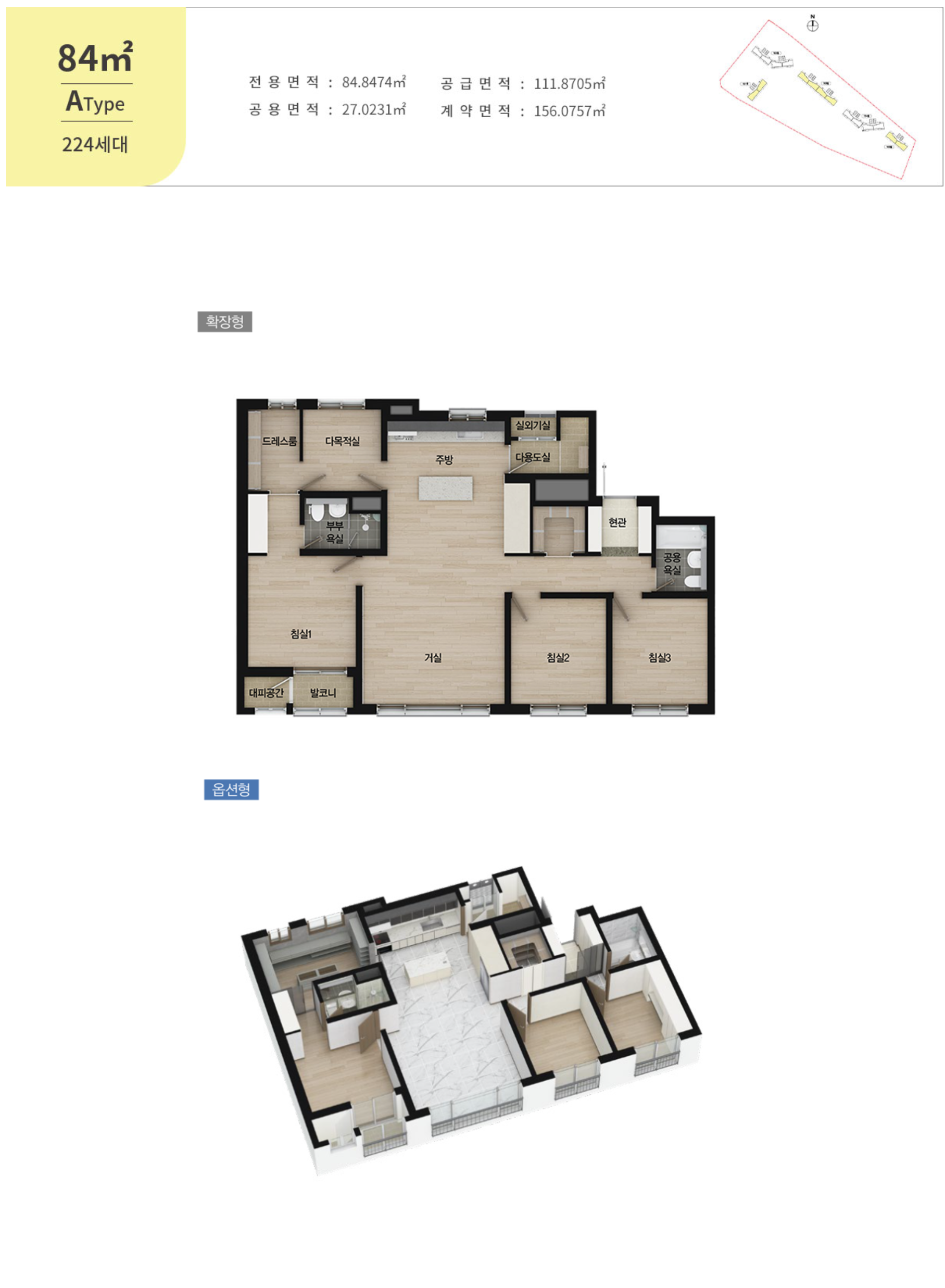 전 세대가 판상형 아파트로 대부분 남향 위주로 배치하고 4-Bay설계로 채광과 통풍을 극대화와 함께 아파트 내부는 멀티룸, 드레스룸, 팬트리, 서재(알파룸) 등 다양한 수납 특화설계로 실사용 면적을 넓혔습니다.