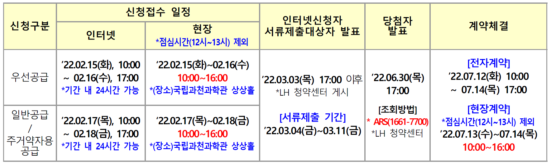 - 우선공급 현장접수 : ‘22.02.15(화) ~’ 22.02.16(수) 10:00~16:00 (점심시간 12시~13시 제외)