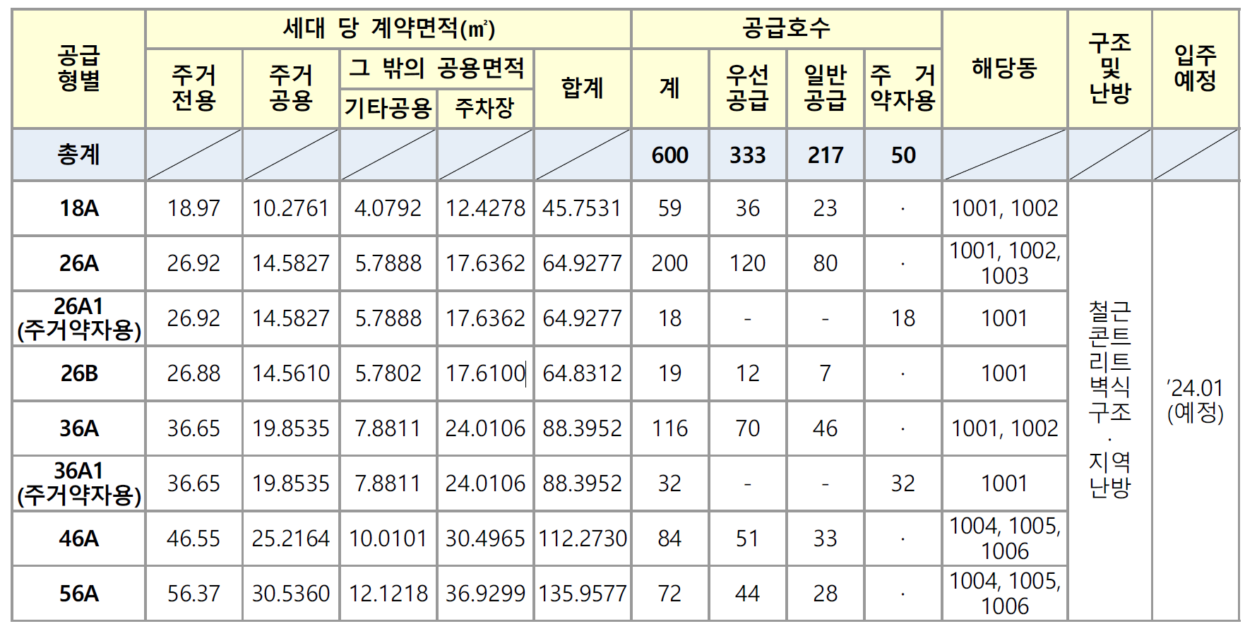 ■ 56A형 5호(1004동 101호, 102호, 1005동 101호, 102호, 1006동 102호)는 입주 개시 전 별도 공고를 통해 어린이집으로 공급될 예정입니다.