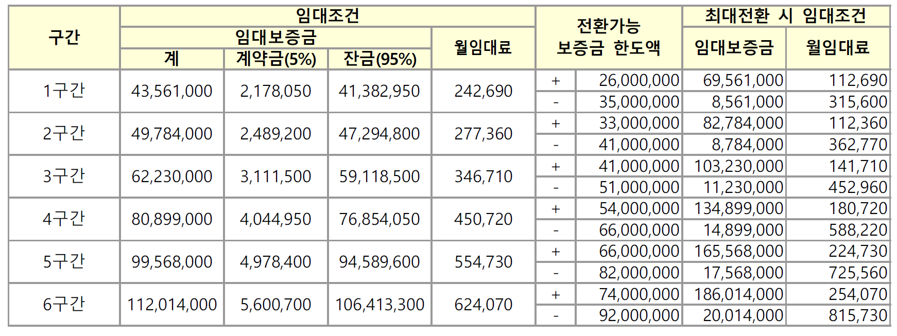 최대 전환 시 임대조건은 월 임대료의 임대보증금으로 전환 시 이율 연 6%, 임대보증금의 월 임대료로 전환 시 이율 연 2.5%를 적용하여 산정한 것으로서, 향후 전환이율이 변경되는 때에는 변경된 이율을 적용하여 다시 산정하게 됩니다.