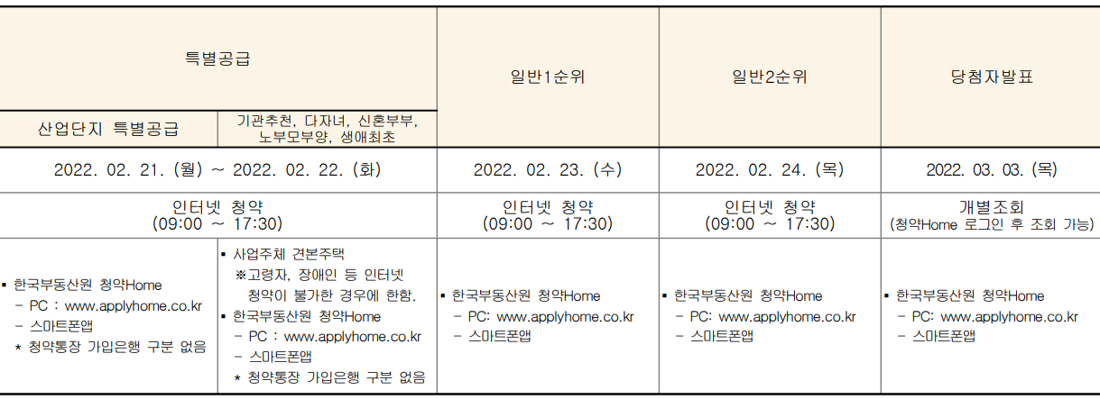 2월 21일 월요일부터 2월 22일 화요일까지 산업단지 특별공급 및 기관추천, 다자녀, 신혼부부, 노부모 부양, 생애최초 특별공급을 진행하며,