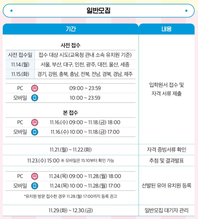 기간은 11월 14일 월요일부터 일반모집 기간이지만 사전접수 일정과 본접수 일정으로 구분됩니다.