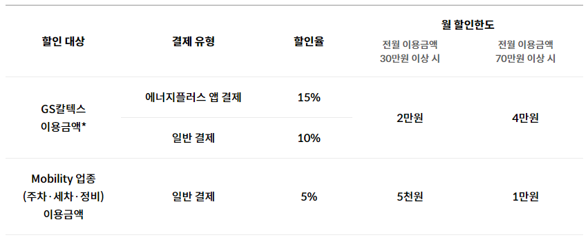 에너지플러스카드 Edition2 카드 또한 전월 이용금액 산정 기준이 있는데 30만원 이상, 70만원 이상입니다. 하지만 전월 이용금액 합산 제외 기준으로 GS칼텍스 이용금액 및 Mobility 할인적용된 결제금액은 합산실적에 포함되지 않습니다.