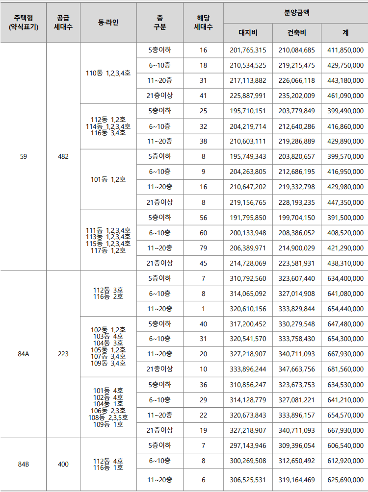 이편한세상 명덕역 퍼스트마크 평면별 공급내역 59㎡형 482세대, 84㎡A형 223세대, 84㎡B형 400세대, 84㎡C형 7세대로 총 1,112세대를 이번 청약일정에 분양합니다.