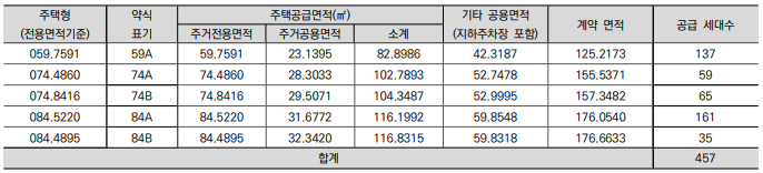 공급규모는 지하 2층부터 지상 29층~36층 4개 동으로 구성되어 있으며, 총 457세대 중 일반공급 35세대를 분양합니다.
