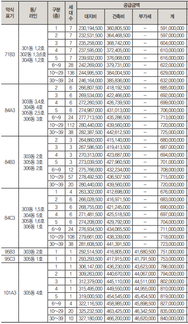 상기 분양금액에는 주택형별 소유권 이전등기비용, 취득세(등록세 포함), 인지세 등이 미포함되어 있으며, 전용면적 85㎡를 초과하는 주택형은 부가가치세가 포함된 금액입니다.