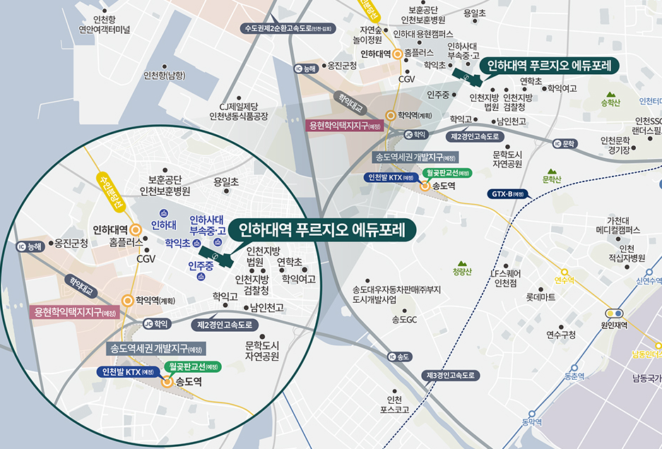 인하대역 푸르지오 에듀포레 아파트의 매력은 역시 교육입지입니다. 단지 바로 앞 학익초, 인주중, 인하사대부속중학교, 인하사대부속고등학교, 인하대 등 학군이 밀집한 교육 중심지로 아이 키우기 좋은 교육환경입니다.