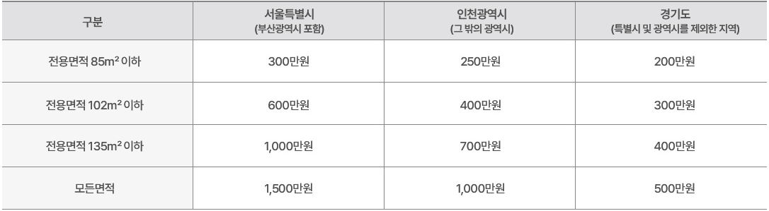 청약통장 가입 1년 이상, 지역별, 면적별 예치금액 충족 시 전용면적에 따른 예치금액이 상이하므로 다음 표를 참고하세요.
