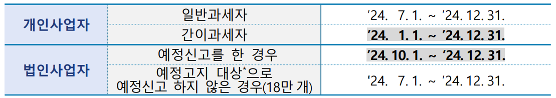 신고대상 과세기간은 개인 일반과세자의 경우 7월 1일부터 12월 31일이며, 간이과세자는 1월 1일부터 12월 31일입니다. 법인사업자는 분기별로 예정신고를 하게 되므로 신고대상에 따른 과세기간은 다음과 같습니다.