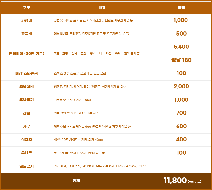진심왕돈까스 창업 매장규모를 30평 기준으로 정리해 보았습니다. 본사 창업비용 예상금액으로는 부가세 별도로 1억 1,800만 원으로 점포의 여건에 따라 변동될 수 있으므로 참고해 주시면 되겠습니다.