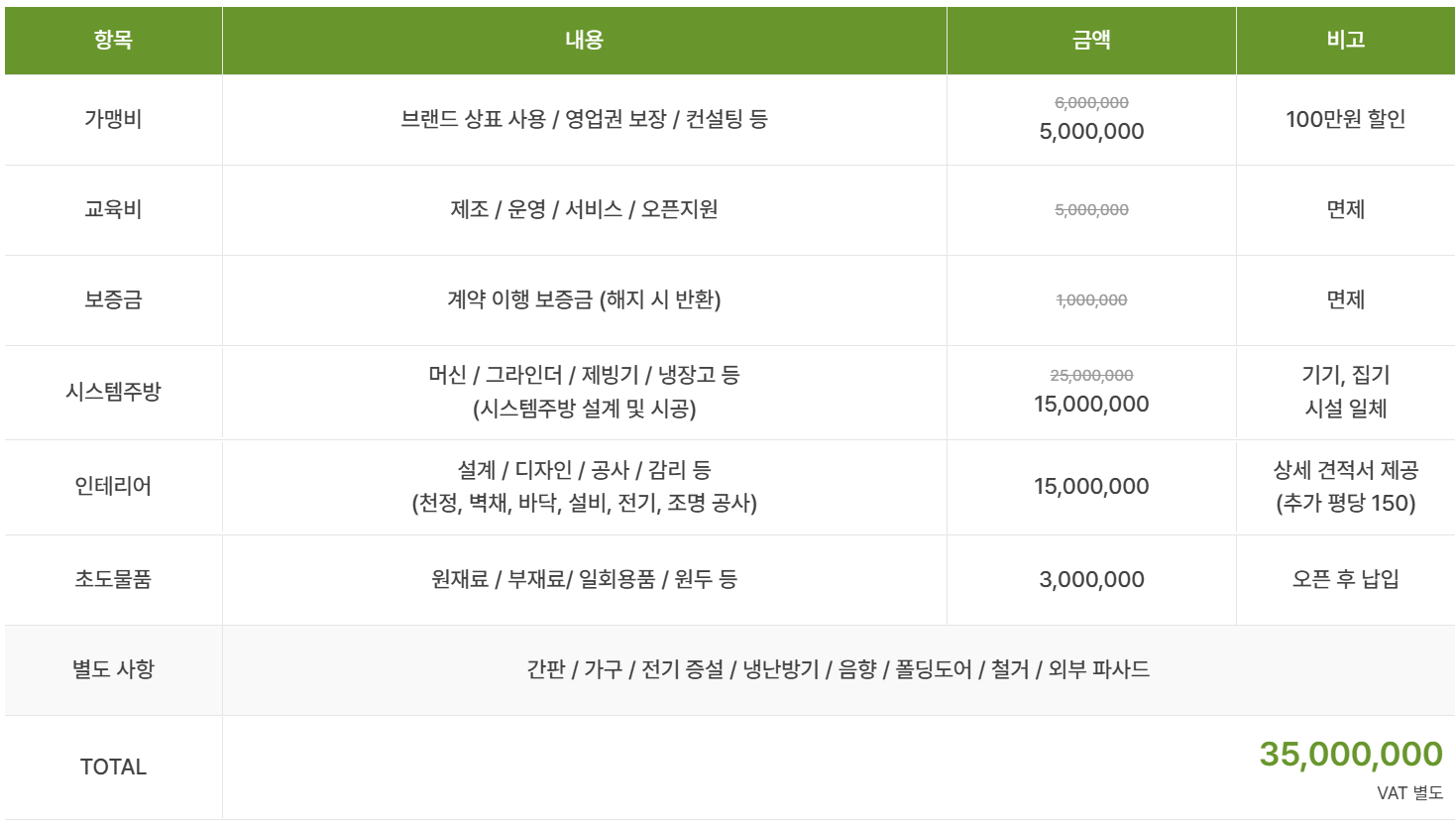 상기 비용은 본사 메뉴얼에 따른 창업비용이며, 점포의 면적, 상권, 가맹점 형태에 따라 금액은 변동될 수 있습니다.