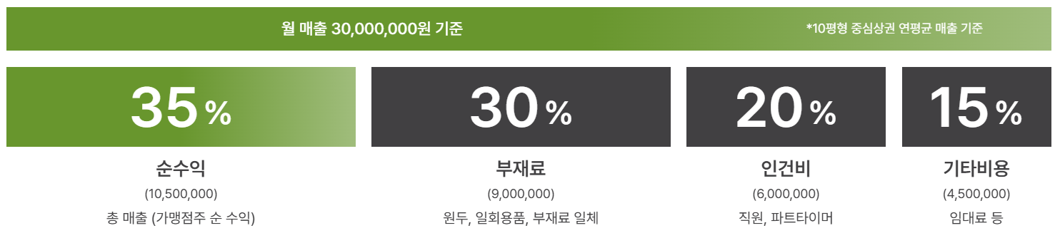 본사 기준으로 10평형 중심 상권의 월 매출 3,000만 원을 기준으로 창업수익률은 다음과 같습니다.