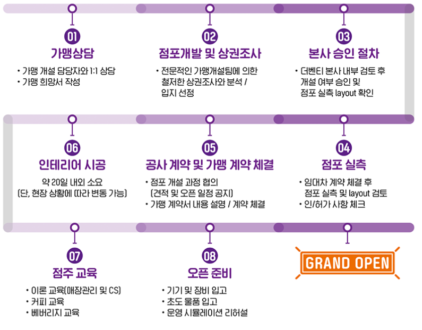 더벤티는 가맹상담부터 오픈까지 모든 과정을 1:1 맞춤으로 신속하게 진행하고 있습니다.