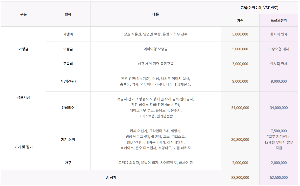 - 가맹비: 일정 금액의 가맹비가 필요하며, 프로모션에 따라 변동 가능