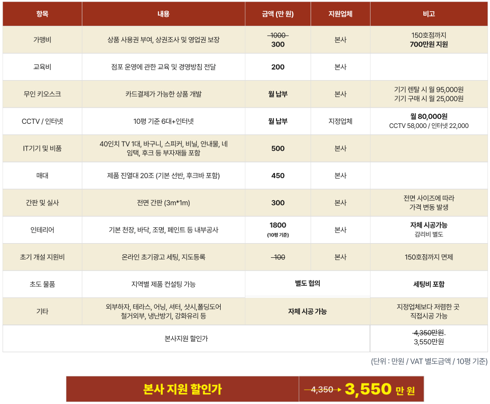 - 현재 가맹비와 교육비는 면제 혜택이 제공됩니다.