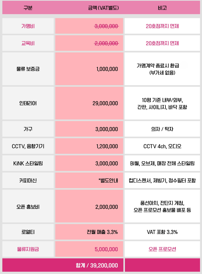 10평 매장 기준 킨크커피 창업 예상비용 구성은 커피머신 제외로 20호점까지는 가맹비, 교육비 면제 창업지원혜택을 받아 3,920만 원입니다.