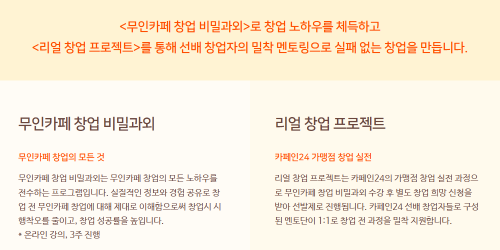 카페인24는 예비 창업자를 위한 단계별 지원 프로그램과 커뮤니티를 운영합니다.