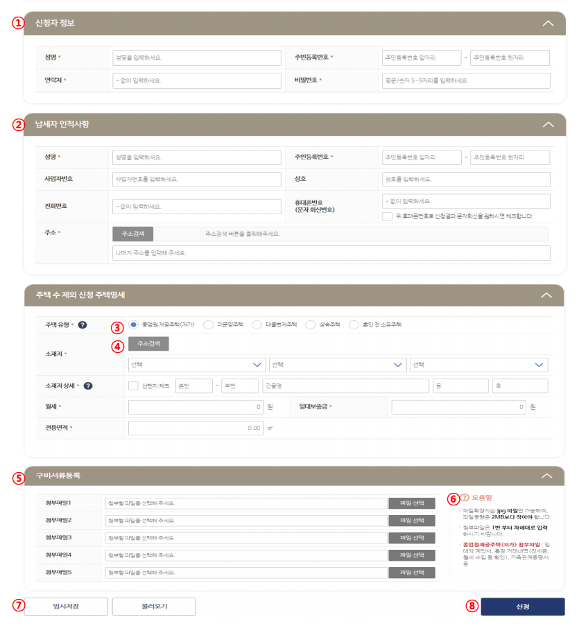 주택 수 산정 제외 신청은 세율 특례 적용을 위한 주택 수 산정 제외를 최초로 적용 받고자 하거나, 기존 신청 내용에 변경사항이 있을때 작성하면 되는데 공동으로 소유하는 주택은 지분 소유자별로 각각 주택 수 산정 제외 신청이 필요합니다.