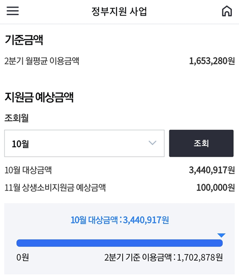 2분기 월평균 이용금액이 1,653,280원이였는데 10월에는 3,440,917원을 사용했네요. 10월에만 1,787,637원을 더 지출했는데 상생소비지원금을 받을 수 있습니다. 처음 상생소비지원금을 들었을 때는 2분기보다 3%만 넘으면 10만원 받는 줄 알았는데 3% 넘은 금액의 10%를 카드 포인트로 받는 혜택인데 월 제공한도는 10만 포인트로 10월과 11월 합산 20만원이 최대 받을 수 있는 지원금입니다.