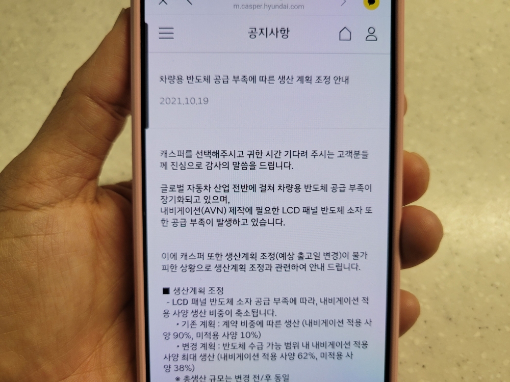 차량용 반도체 공급 부족에 따른 생산 계획 조정 안내! 제가 계약한 캐스퍼 모델은 중간트림인 캐스퍼모던인데 다행스럽게도 기본옵션이라 캐스퍼 예상출고일 오히려 단축되었습니다.